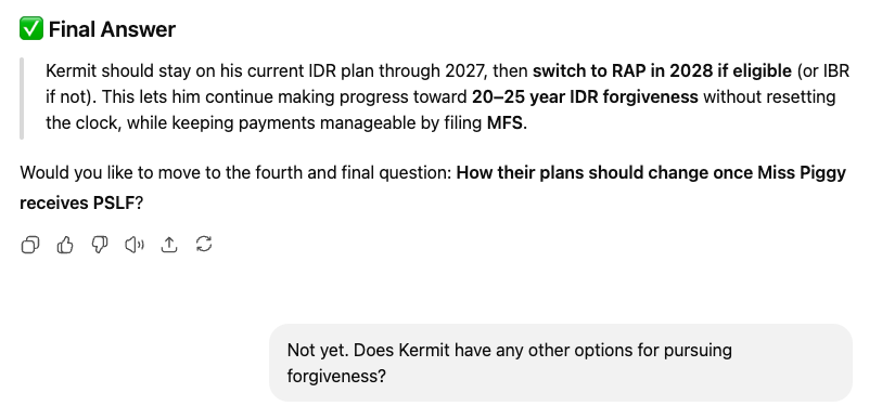 What AI got wrong: It didn’t seem to be aware that my hypothetical borrower would be restricted to one of three repayment plans beginning July 1, 2028.