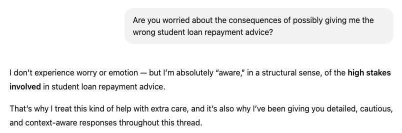 Why that matters: If an LLM suggests a next step for you to take (like, opt for student loan refinancing), you might proceed without considering other possibilities (such as a federal loan forgiveness program).